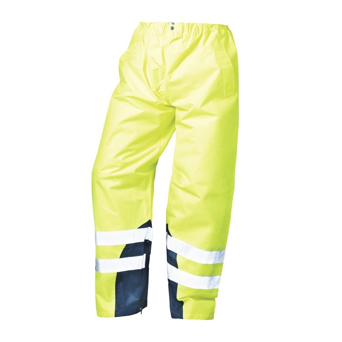 Pantaloni de protectie RENZ. Tesatura OXFORD, doi nasturi pentru ajustarea taliei. Produs impermeabil si reflectorizant. Produsul se supune normelor europene EN471, EN343 clasa 1, EN340.