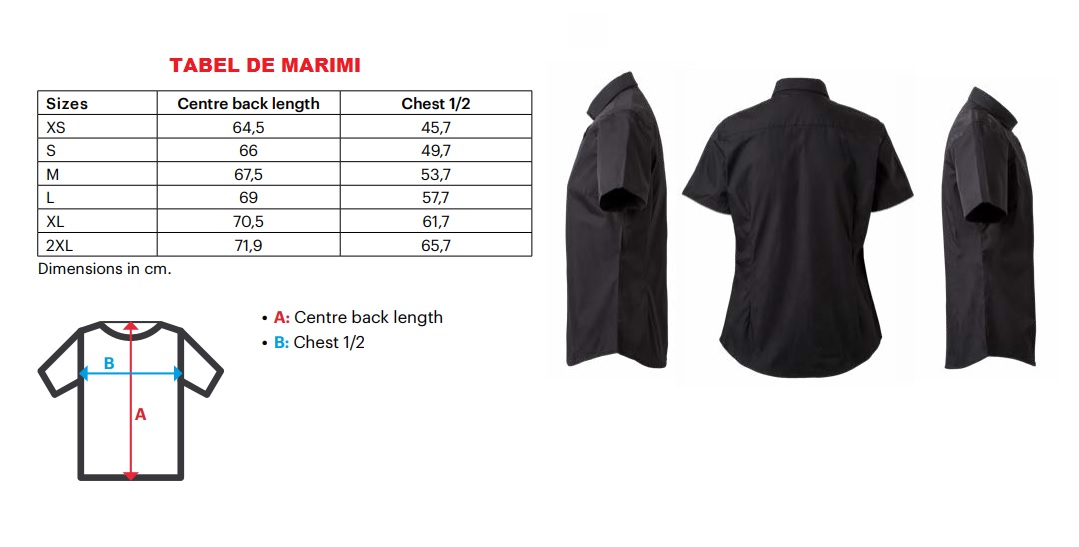 Modelul se remarca printr-un guler in stil italian, un design modern cu maneci scurte, inchidere frontala cu nasturi tip English placket si pense de forma atat in fata, cat si in spate, pentru o croiala cambrata ce evidentiaza silueta feminina. Detaliile atent finisate, precum platca de la spate si nasturele de rezerva, subliniaza calitatea si functionalitatea acestei piese vestimentare.
