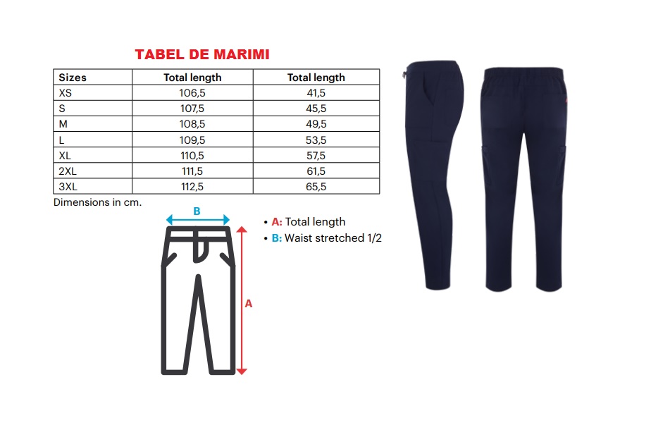 Detalii practice: pantaloni cu talie elastica si snur reglabil, picior drept pentru un aspect profesional.