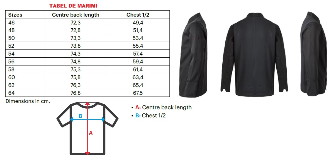 Aceasta tunica de bucatar cu maneci lungi este realizata dintr-un material combinat de inalta calitate – Twill 100% bumbac egiptean in partea frontala si GESDRY+ 100% poliester respirabil la spate, cu o greutate de 180 GSM, oferind durabilitate si respirabilitate in timpul orelor de lucru intense.