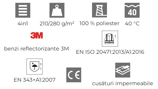 - Certificare: Conform standardelor EN ISO 20471 (clasele 3, 1), EN 343+A1 (clasa 3:1), EN ISO 13688.