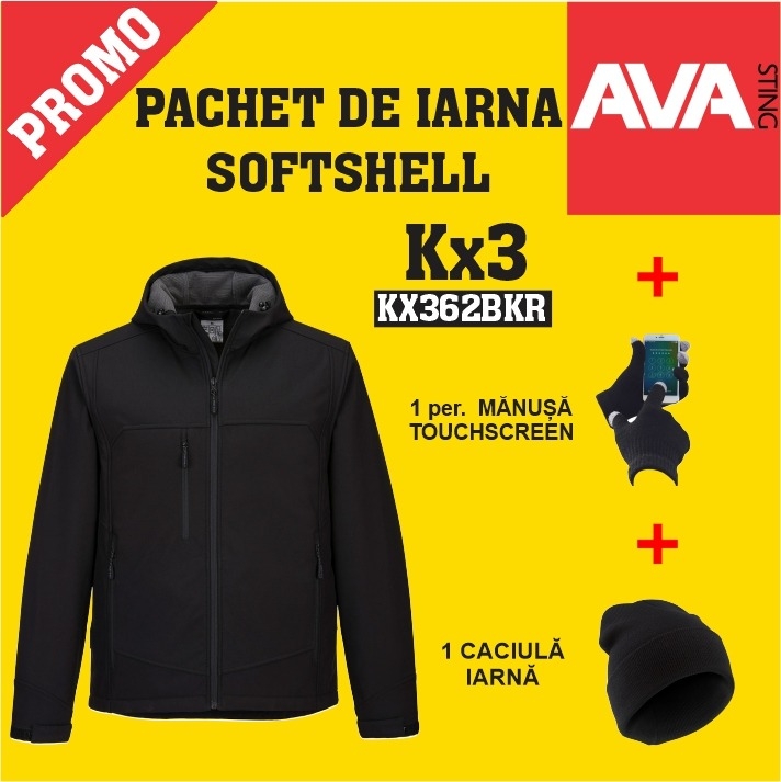Pachet PROMO Jacheta de iarna softshell KX362BKR + manusa TOUCHSCREEN GL16BKR + caciula iarna WCAP