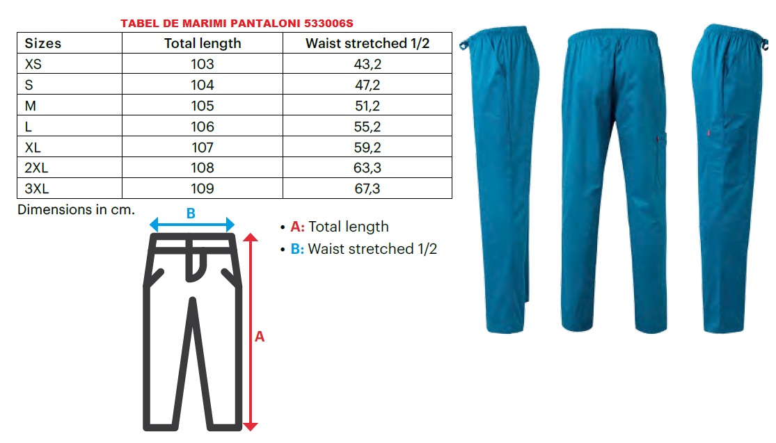 Realizati din material stretch de inalta calitate (62% poliester, 34% bumbac, 4% elastan), 185 GR/MP, acesti pantaloni sunt alegerea ideala pentru personal medical, stomatologic, farmaceutic, veterinar sau din industria alimentara.