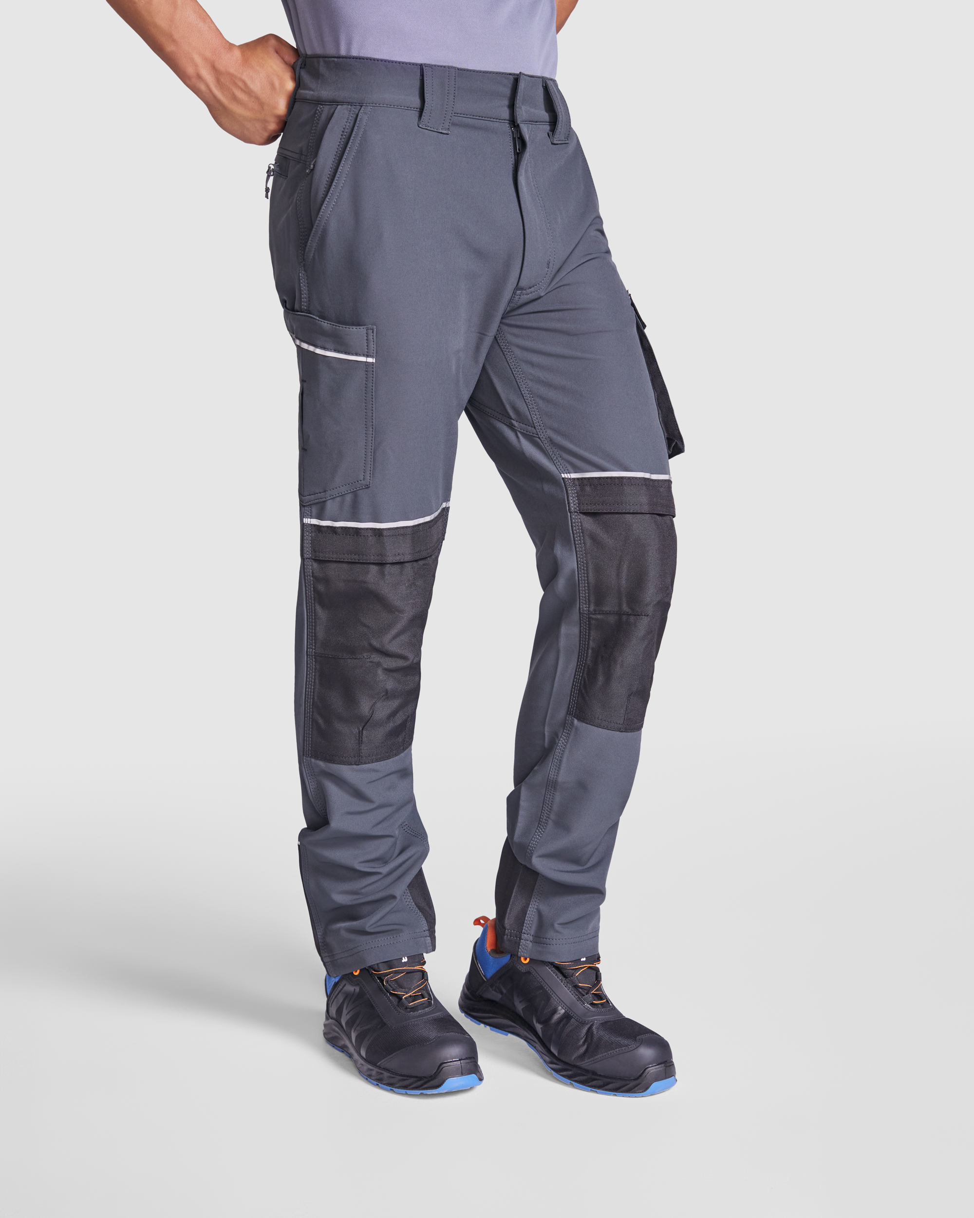 - Buzunare pentru genunchi cu clapetă fixă și bandă reflectorizantă pentru vizibilitate sporită.