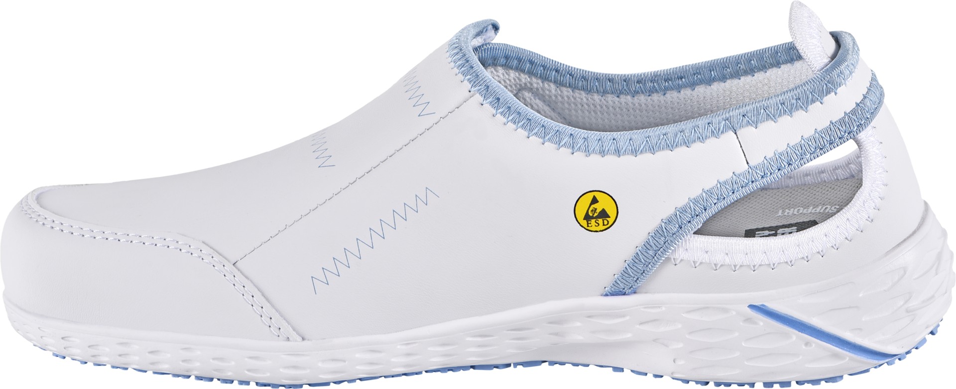 Echipati cu tălpi antiderapante SR, saboții asigură aderență excelentă atât pe suprafețe din oțel, cât și pe ceramică, fiind ideali pentru medii uscate și podele foarte netede. Funcția ESD (descărcare electrostatică) protejează împotriva acumulării de electricitate statică și reduce riscul producerii scânteilor.