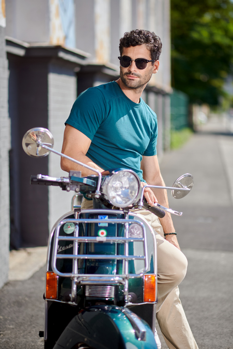 Cu o croială "slim fit" și cusături laterale ingenios realizate, acest tricou îți va pune în valoare silueta într-un mod subtil și elegant. Iar tivul îngust al gulerului, confecționat din material raiat 1:1 și cu adaos de 5% elastan, adaugă un plus de rafinament și exclusivitate.